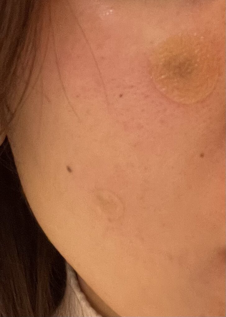 冷却システムにより、肝斑がある方にも悪化させることなく照射できるとのこと。皮膚へのダメージや赤みを最小限に抑えますが、ダウンタイムがあり、照射箇所には再生テープを最低でも2週間貼り続け、取り外し時は再来院が促されています。(自分で外しても良いが、副作用がある可能性のため)