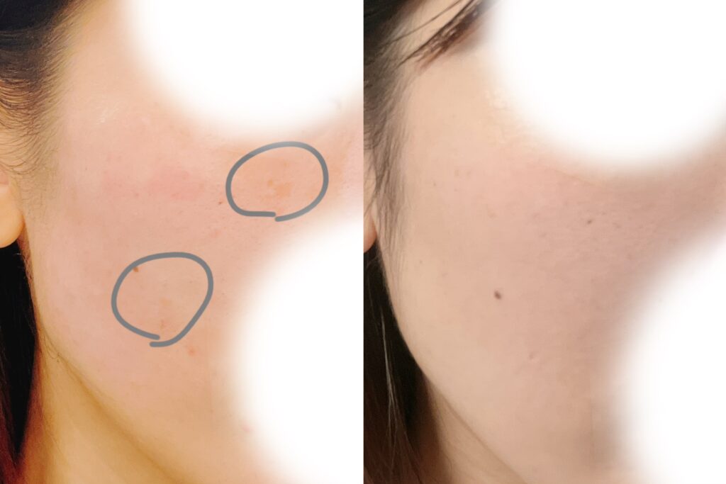 そのため、今回は小さめのシミ2箇所をリポットレーザーで、他の左右目元下はワンデー色素パッケージを受けることとしました!